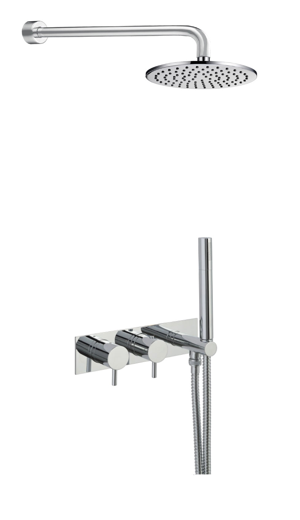 Includes 2 outlet concealed thermostatic valve with integrated hand shower/outlet,190mm shower head and 300mm shower arm.