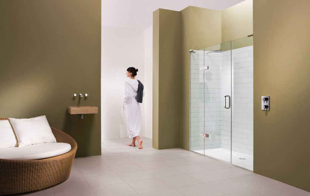 Returns Department, Bathrooms by FountainMatki Eauzone hinge door with hinge panel and inline panel for recess, door hinged from panel B.
