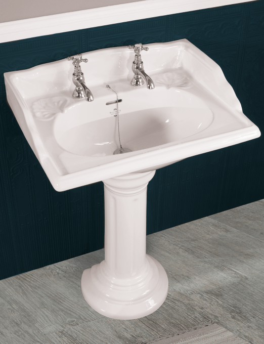 Beautiful traditional style, based on original pieces with distinctive high splashback and strong detailing. Choice of fluted or unfluted pedestal.