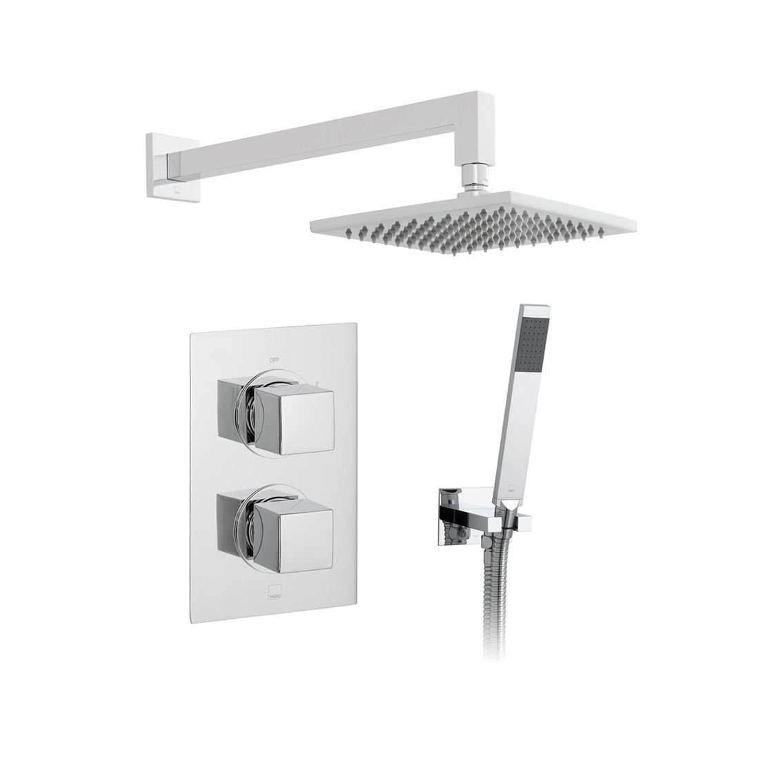 Concealed 2 outlet DX Mix thermostatic valve with square Atmosphere 200mm head with arm and Instinct single function shower kit with integrated outlet and bracket.
