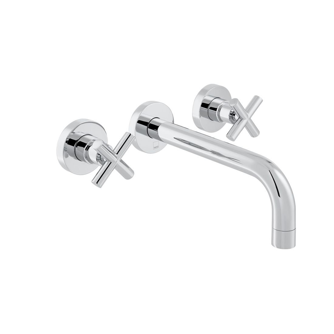 Returns Department, Bathrooms by FountainVado Elements wall mounted 3 hole basin mixer tap with cross handles and 200mm spout.