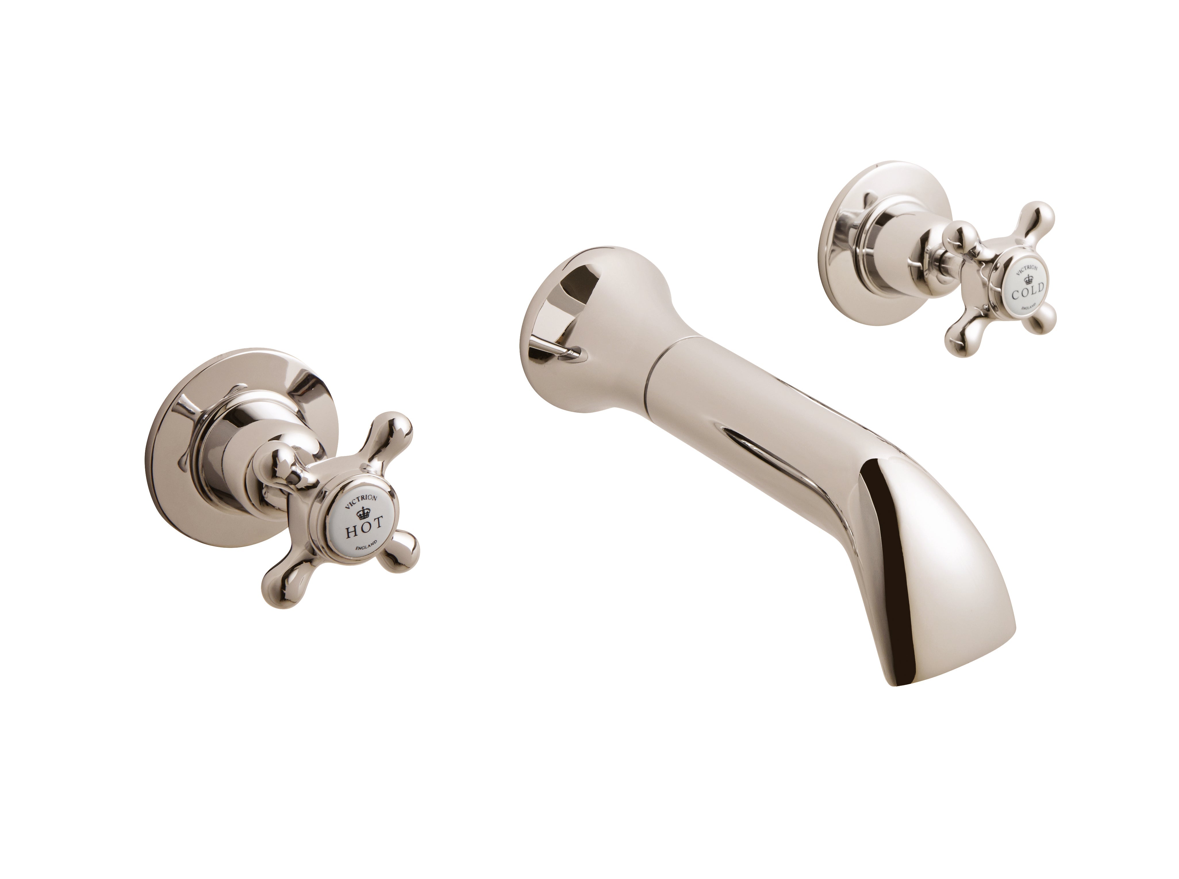 Returns Department, Bathrooms by FountainBC Designs Victrion Crosshead 3 hole wall basin filler with spout. Traditional style wall mounted basin mixer taps available in a choice of finishes - Chrome, Copper, Nickel and Gold in brushed or polished.